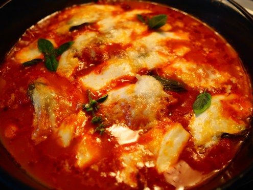 - Die Pouletstücke nebeneinander in der Form in die Tomatensauce legen. Jedes Stück mit Parmesan, etwas Tomatensauce, 1 Basilikumblatt sowie 1 Mozzarellascheibe belegen.