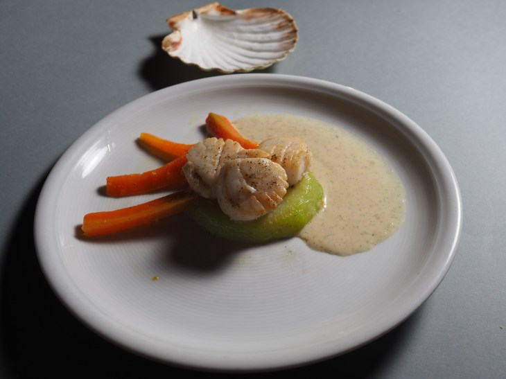 - Die Jakobsnüsse auf den Kohlrabi-Rondellen anrichten, mit den Karotten und der Sauce garnieren.