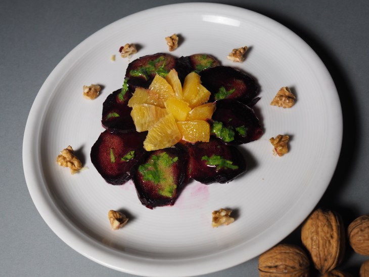 - Alle restlichen Zutaten zu einer Sauce verrühren und über die Randen träufeln.