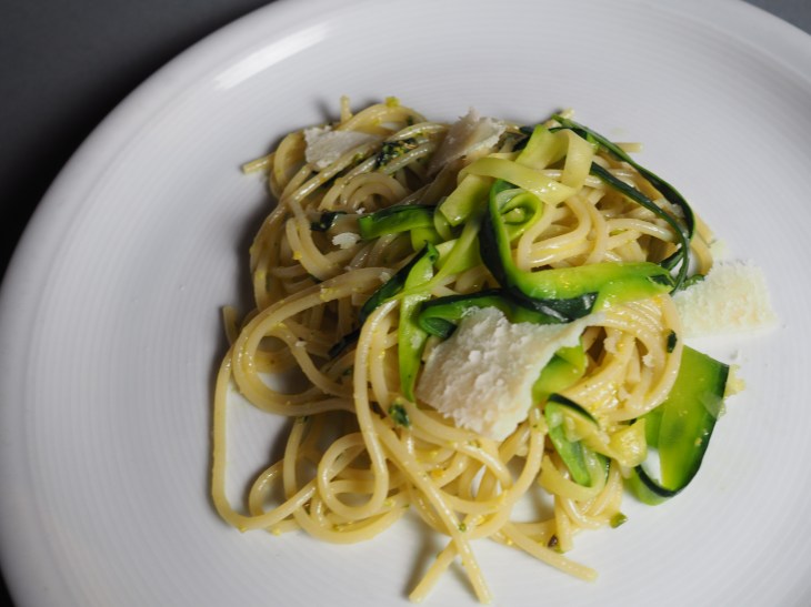 - Das Pesto mit den Spaghetti verrühren, die Zucchetti beigeben und mit Parmesan garnieren.