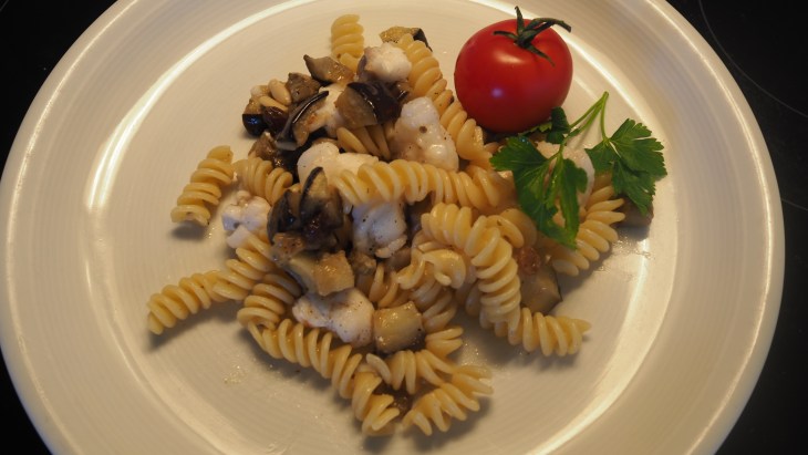 - Gleichzeitig in einer Pfanne das Olivenöl erwärmen und den Fisch während 2 bis 3 Min. bei mittlerer Hitze anbraten, die Auberginen, die Rosinen, die Pinienkerne, das Pastawasser und die Pasta beigeben und gut mischen. Mit Salz und Pfeffer würzen und etwas Olivenöl darübergiessen.