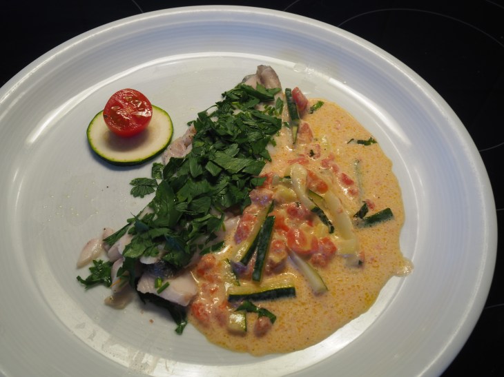 - Den Weisswein in die Pfanne giessen und zur Hälfte einkochen lassen. Den Rahm beifügen und kurz kochen lassen. Mit Salz und Pfeffer würzen. Zucchetti, Tomaten und Basilikum beifügen und die Sauce beiseitestellen.