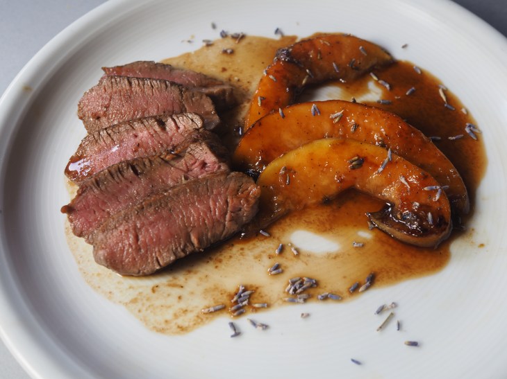 - Das Fleisch in Tranchen schneiden und mit den Melonenschnitzen anrichten. Wenig Lavendelblüten darüberstreuen.