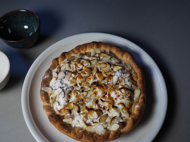 - Den Kuchen während ca. 40 Min. im vorgeheizten Ofen backen, leicht auskühlen lassen und mit Mandelblättchen und Puderzucker bestreuen. Den Kuchen kurz unter dem Grill karamellisieren.