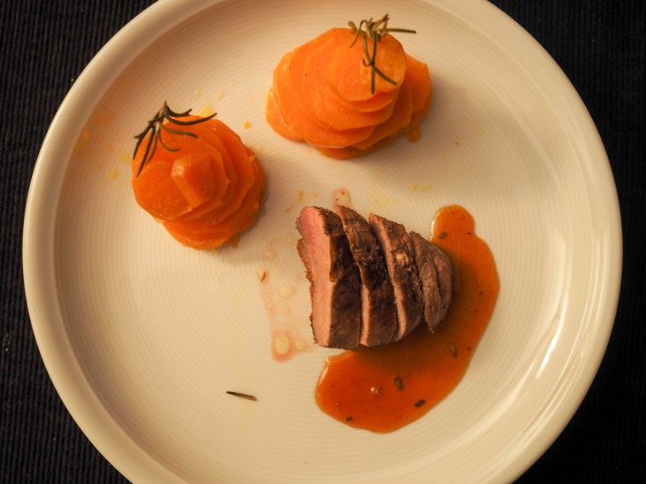 - Die Entenbrüstli tranchieren und mit der Sauce servieren.