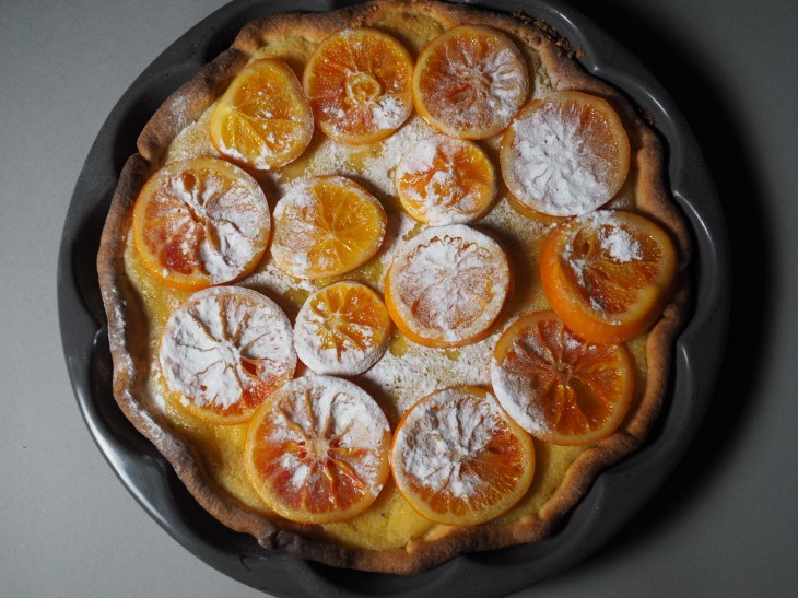 - Die Crostata abkühlen lassen und vor dem Servieren mit den Orangenscheiben belegen.