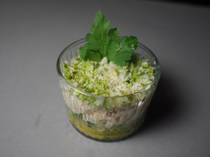 - Den Blumenkohl/Broccoli-Salat auf 4 Gläser verteilen, das Felchenfilet-Rillete daraufgeben und mit der geriebenen Broccoli/Blumenkohl-Mischung garnieren.