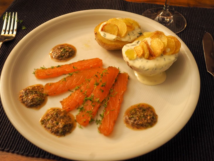 - Vor dem Servieren den Lachs kurz kalt abspülen und fein aufschneiden. Grosszügig mit Dill bestreuen und zusammen mit der Senfsauce anrichten.