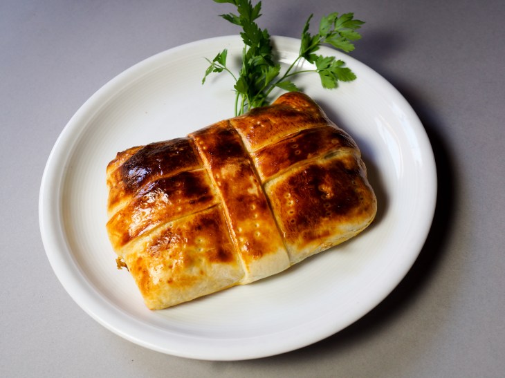 - Den Backofen auf 220°C vorheizen. Den Blätterteig-Weggen mit einer Gabel einstechen und mit dem Eigelb einstreichen. Etwa 20 Min. im Ofen backen.