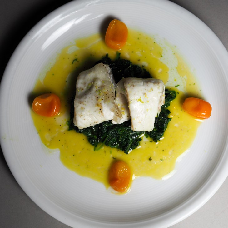- Den Fisch mit dieser Zitronensauce übergiessen und auf einem Spinatbett anrichten. Den Teller mit den Kumquats garnieren.