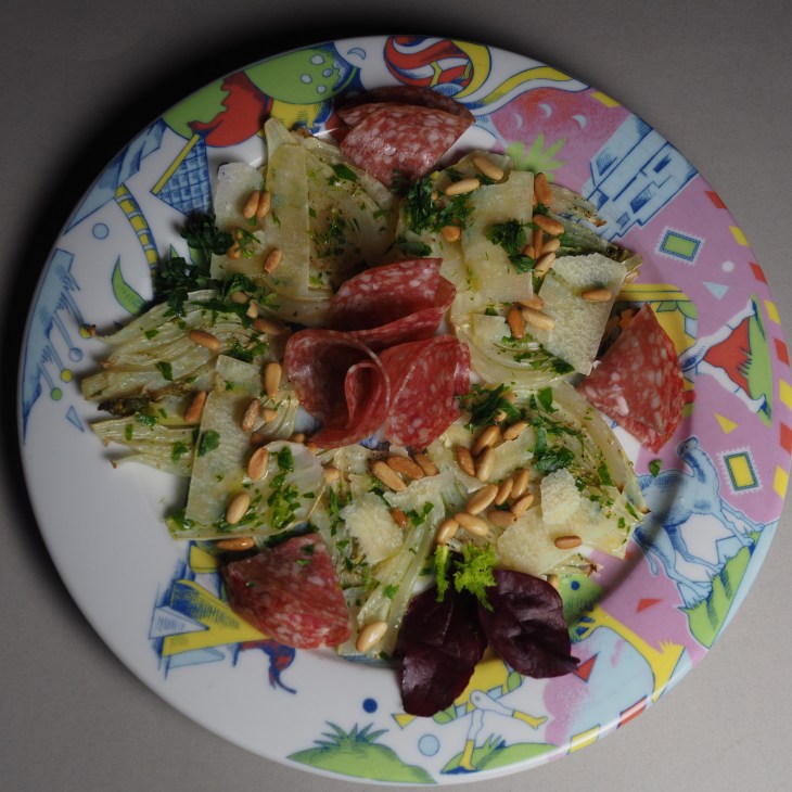 Das Carpaccio bringt man eher in Zusammenhang mit rohem Fleisch oder Fisch. Meine Variante habe ich mit Fenchel zubereitet, wobei sich auch andere Gemüse wie Randen ebenfalls eignen würden.