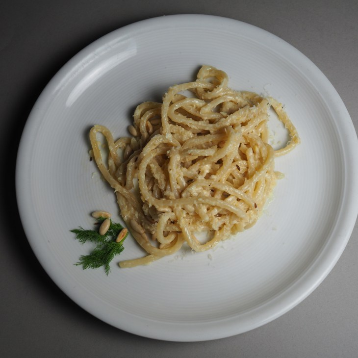 - In der Zwischenzeit die Pici al dente kochen, etwas Kochwasser zur Fenchelsauce geben und alles mischen.