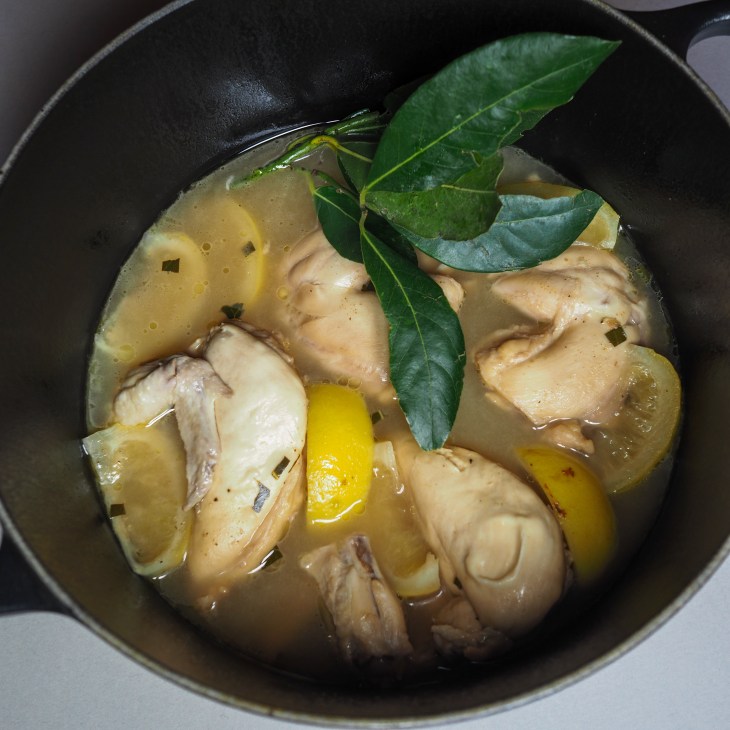 - Das Coquelet in vier Teile schneiden und die Haut entfernen. Die Zitrone und das Coquelet in den Bräter geben, mit dem Jus übergiessen und während 45 Min. zugedeckt köcheln.
