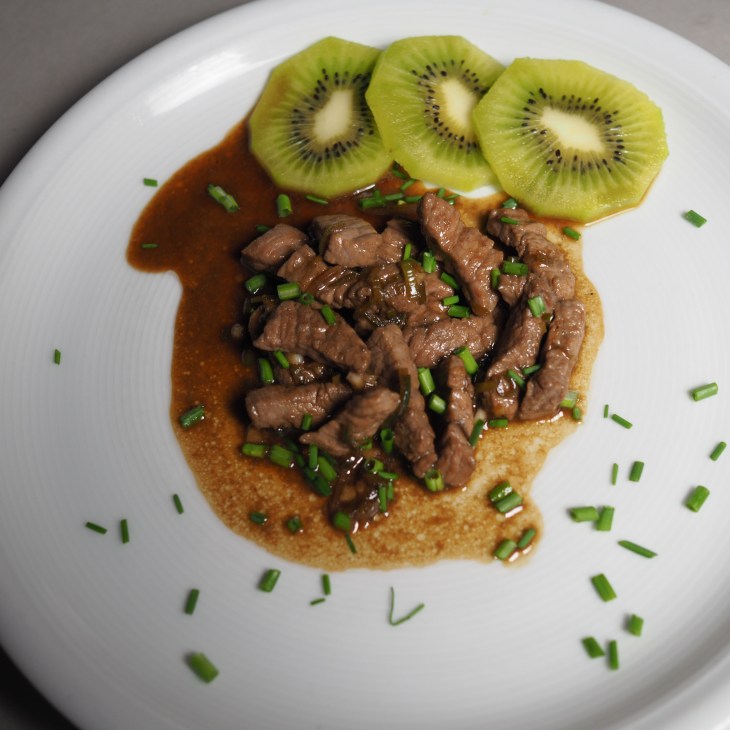 - Etwas Öl im Wok erhitzen. Das Fleisch aus der Marinade heben und kräftig anbraten, die Marinade dazugeben, etwas einkochen lassen und zum Schluss mit etwas Sojasauce abschmecken.