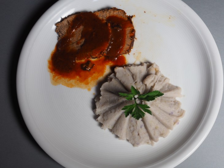 - Den Braten aufschneiden und die Sauce mit Salz und Pfeffer abschmecken.