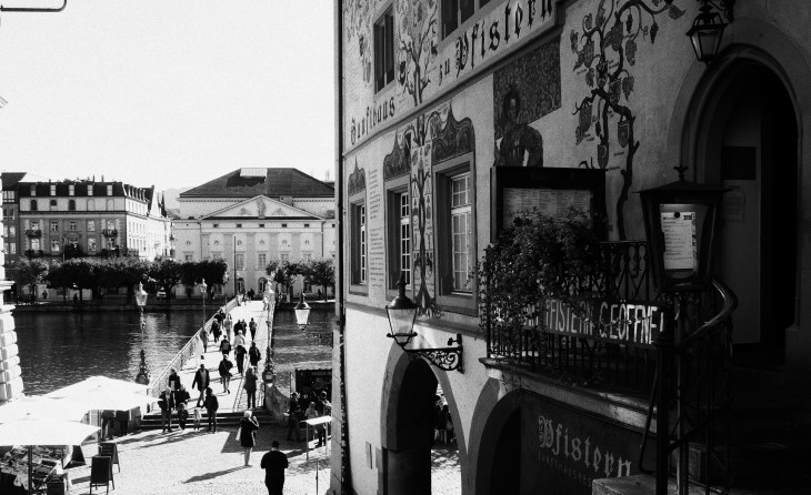 Mit Fresken geschmückte Häuser umsäumen in der Altstadt Plätze und Gassen.