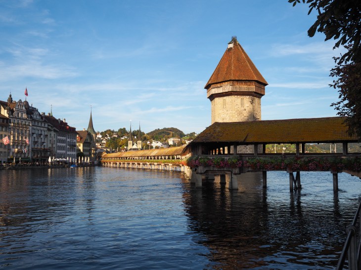Die mittelalterliche Kapellbrücke, ein Wahrzeichen von Luzern, verbindet die Alt- und Neustadt. Sie ist eine der ältesten überdachten Holzbrücken in Europa.