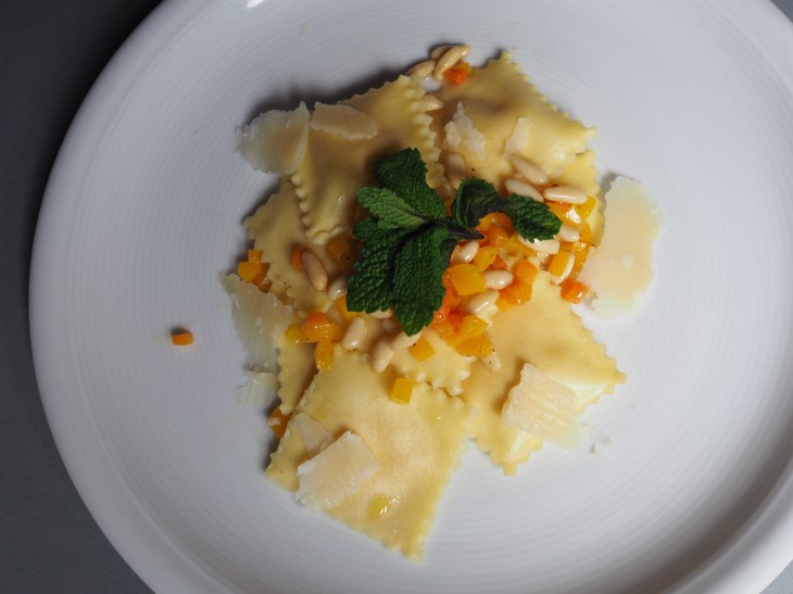 - Die Ravioli abgiessen und die Kürbis- Pinienbutter darübergiessen. Mit Parmesanspänen garnieren.