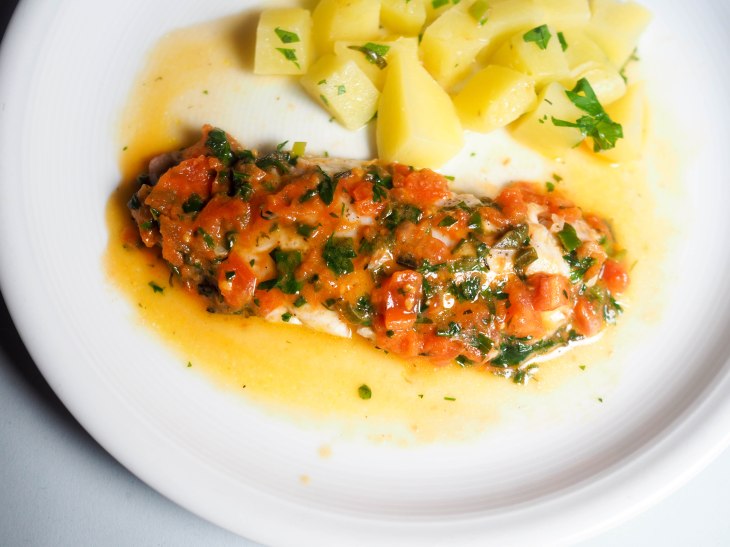 - Den Fisch im Ofen während ca. 2 Min. braten, wenden und weitere 2 Min. fertigbraten. Die Bratzeit ist abhängig von der Dicke der Fischfilets. Den entstandenen Jus auffangen und mit den Tomaten und den Kräutern in einer kleinen Pfanne aufkochen. Mit Salz und Pfeffer abschmecken und über den Fischfilets anrichten.