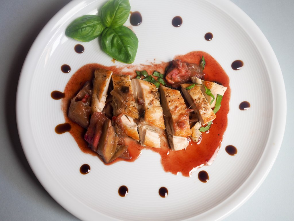 - Die Pouletbrüstchen tranchieren und auf einem Teller anrichten. Die Sauce mit dem Rhabarber darübergeben und servieren.