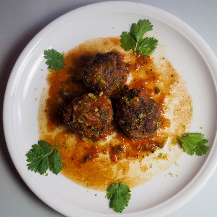 - Das Hackfleisch in eine Schüssel geben, eingeweichtes Brot, Schokolade, Ei, Chiliflocken, Salz, Pfeffer und Koriander zugeben, mischen und von Hand kneten, 8 Bällchen formen.