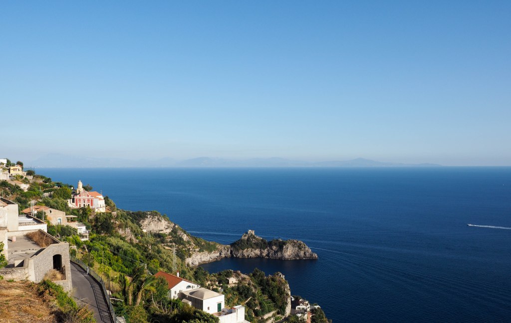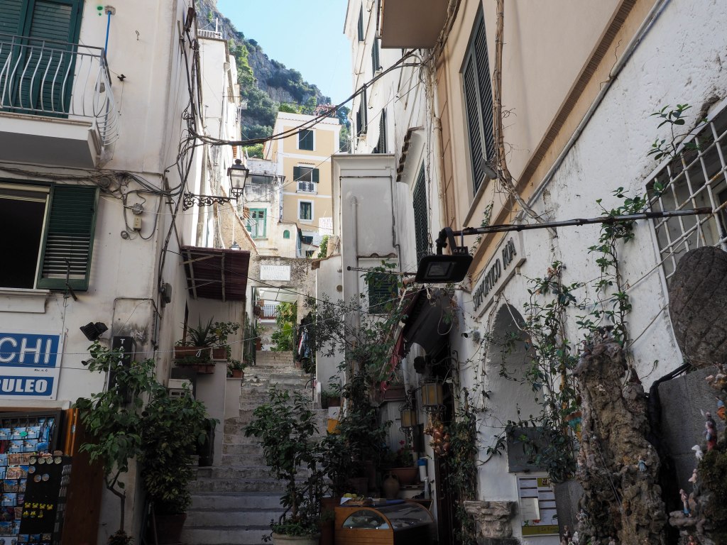 Von Salerno führt eine kurvenreiche Küstenstrasse nach Amalfi. Amalfi ist der bekannteste Ort entlang der Küste. Amalfi hatte lange das Monopol des Exports von Italienischen Produkten auf dem Thyrrenischen Meer und zurück vom Orient kamen Gewürze, Parfums, Perlen, Stoff und Teppiche.