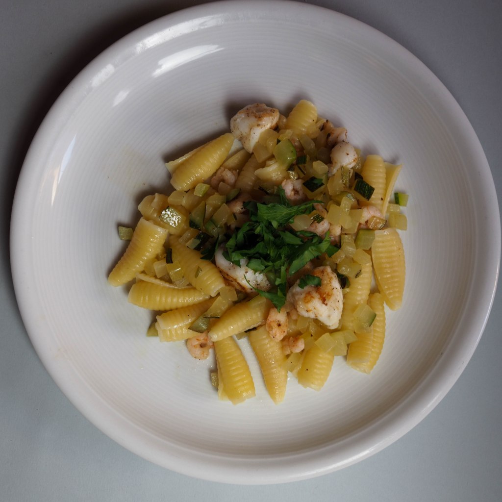 - Zucchetti, Fisch und Gamberoni mit der Pasta mischen und mit Olivenöl überträufeln.