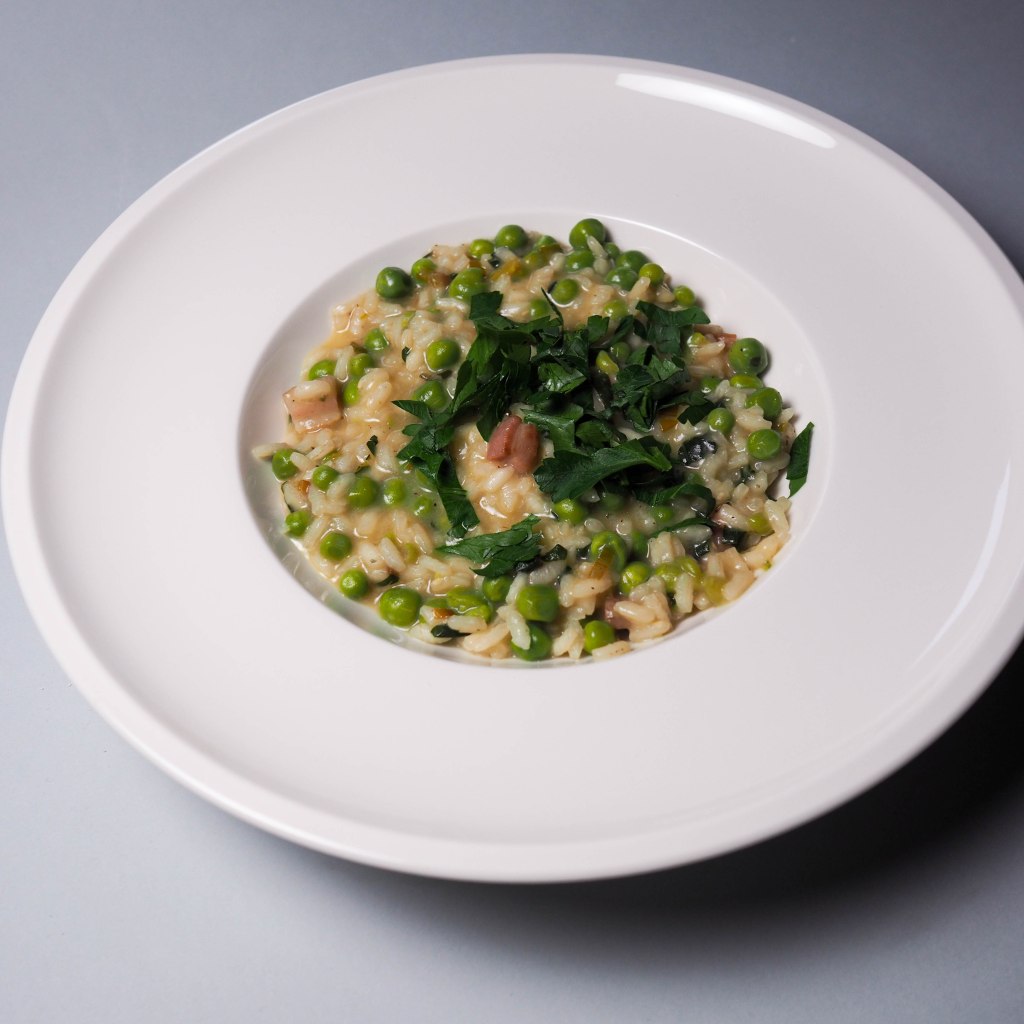 Das Risi e bisi ist eine Art Risotto mit Erbsen und Speck und hier mein Rezept: