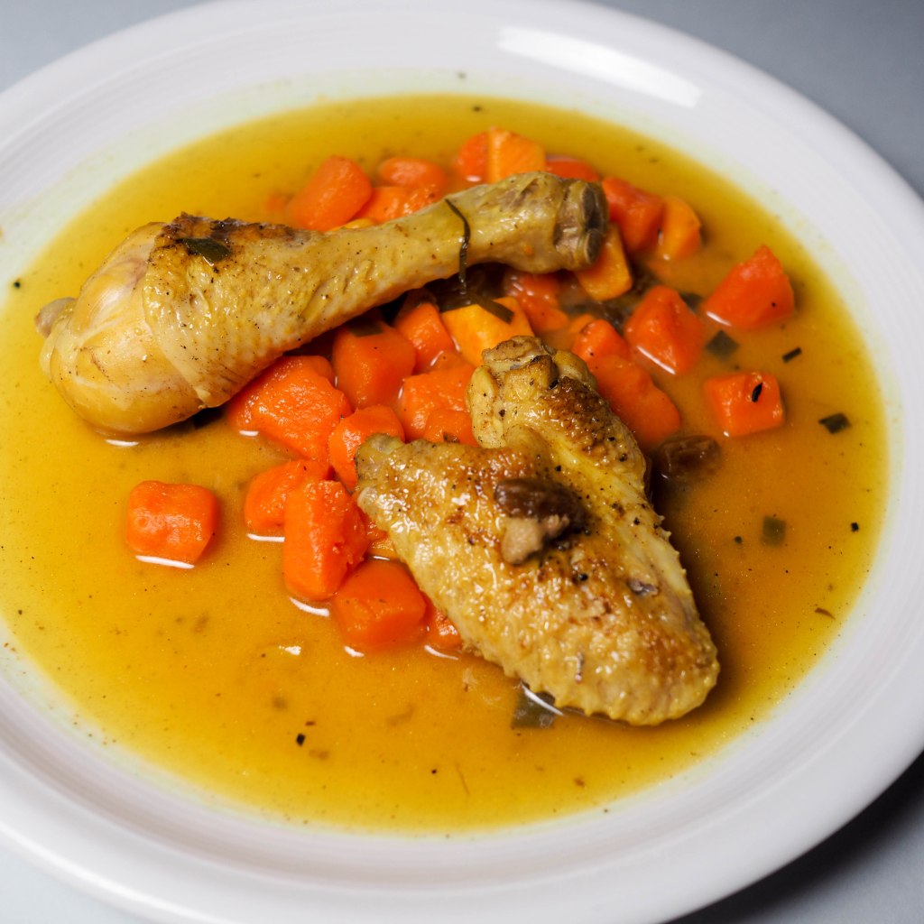 - Die Pouletteile aus dem Bräter nehmen und in einer Alufolie warmhalten. Die Bouillon mit den Süsskartoffeln auf dem Herd erhitzen und den Honig dazugeben. Etwas einkochen lassen und mit Salz und Pfeffer abschmecken.