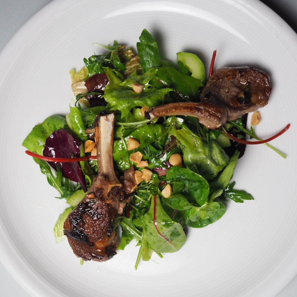 - Die Koteletts mit dem Salat auf einem Teller anrichten.