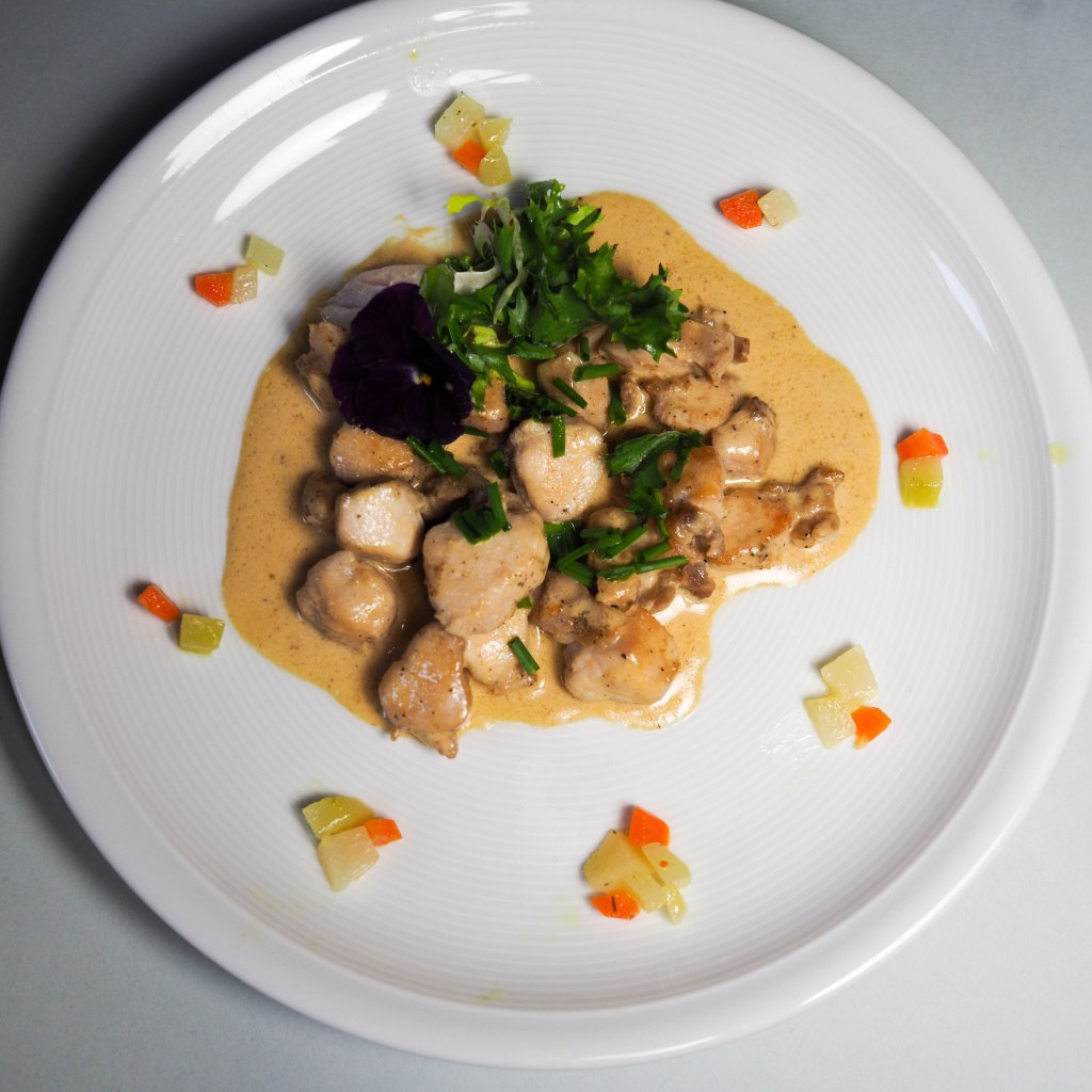 - Das Pouletfleisch wieder dazugeben und kurz erwärmen. Mit Schnittlauch garnieren und servieren.