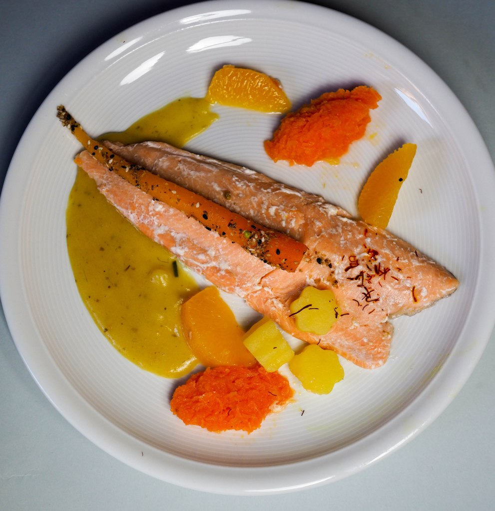 - Die Orange filettieren und und als Garnitur auf dem Teller verwenden. 1 EL Jus zu den geriebenen Karotten geben.