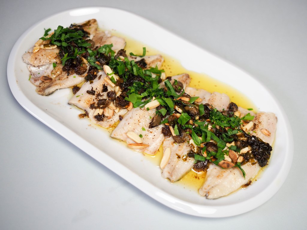 - Die Mandeln und die Kapern über den Fischfilets verteilen, die Kräuter-/Zitronenbutter darübergiessen und mit etwas Pertersilie und Bärlauch bestreuen.