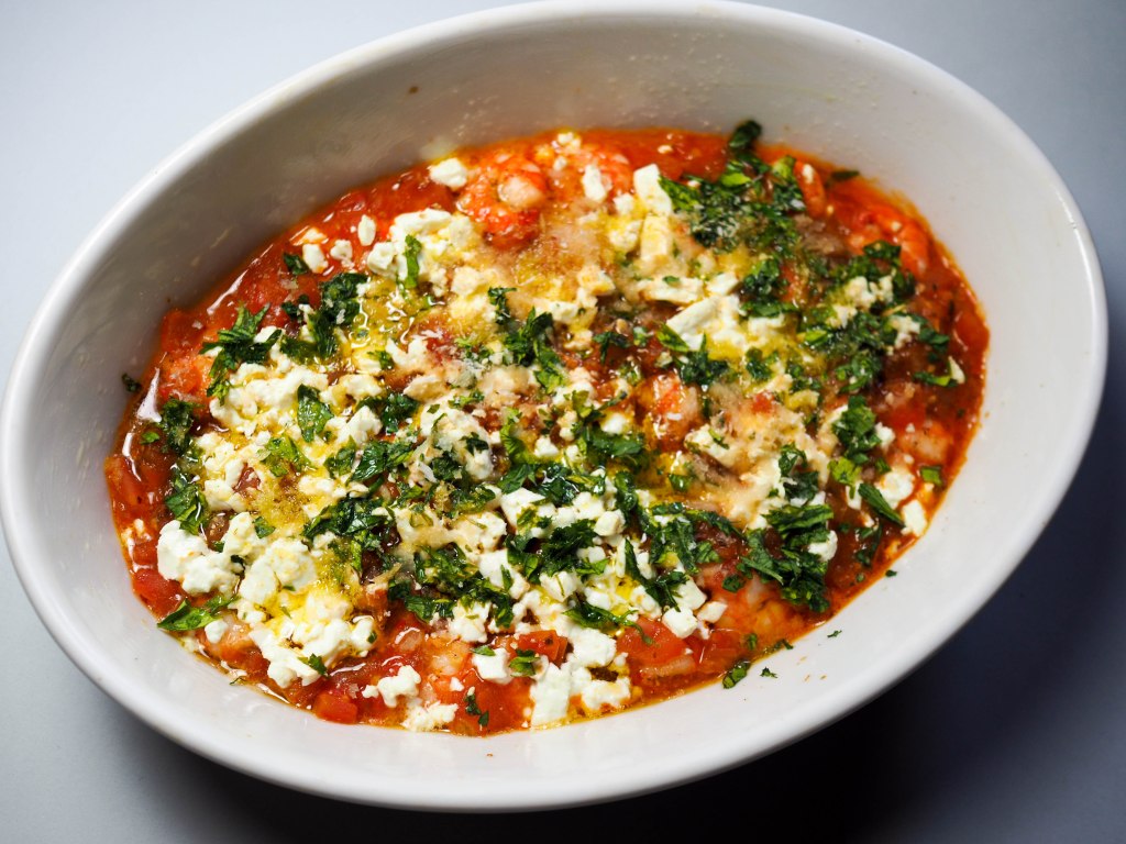 - Den Feta in kleine Stücke schneiden, zusammen mit der Petersilie über die Tomaten verteilen.