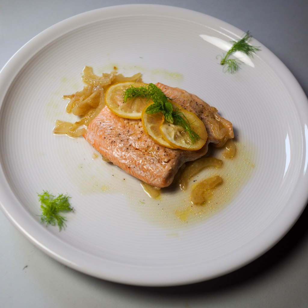 - Den Fenchel in der Mitte einer Backtrennfolie verteilen, den Fisch darauflegen, die Zitronenscheiben darauf verteilen und etwas Olivenöl darüberträufeln.