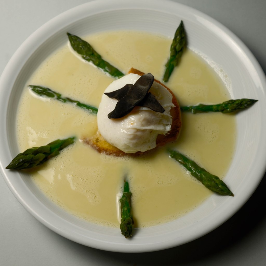- Die Suppe in die Teller giessen. Das getoastete Brot mit dem pochierten Ei in die Mitte des Tellers geben und die Spargelspitzen rund um das Ei anordnen.
