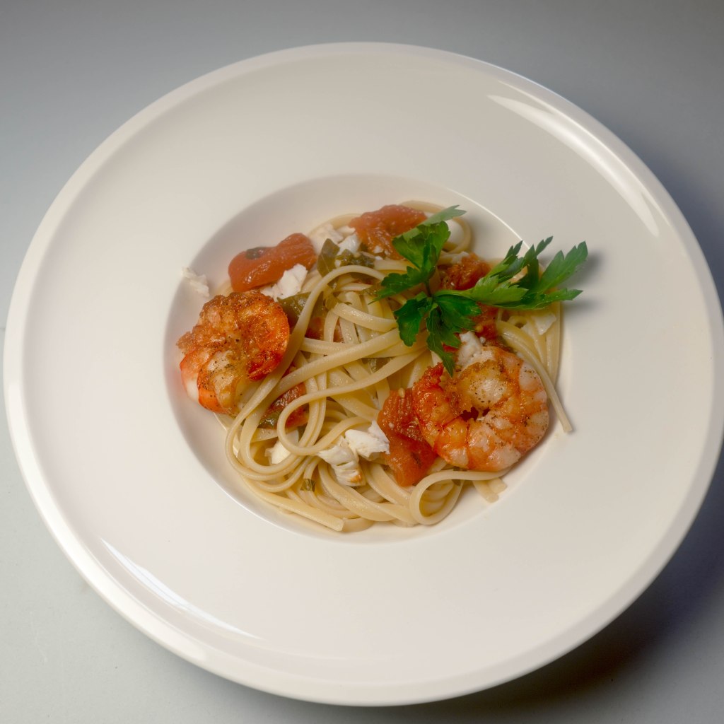 Linguine mit pochiertem Fisch und Crevetten