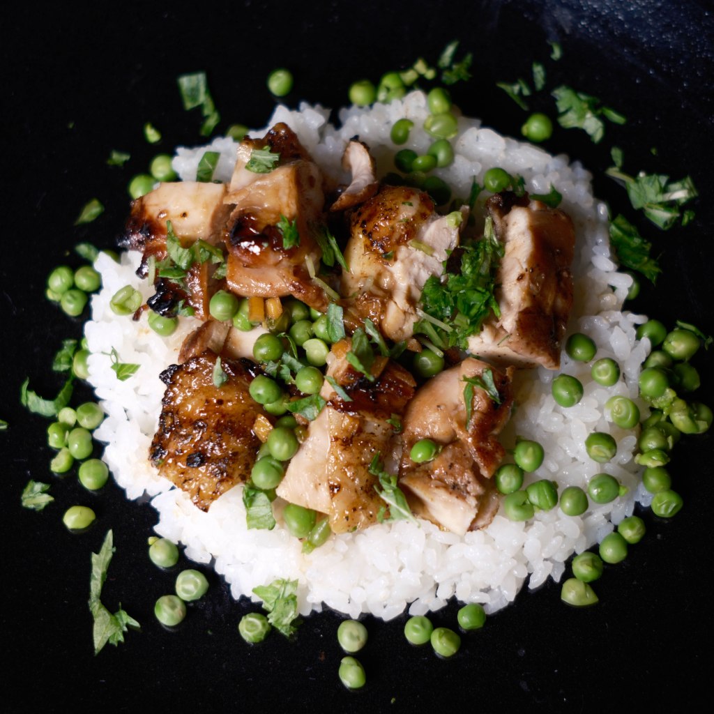 - Sojasauce, Mirin, Ingwer und Knoblauch zusammen in einer Schüssel mischen, die Pouletschenkel mit der Haut dazugeben und während ca. 15 Min marinieren.
