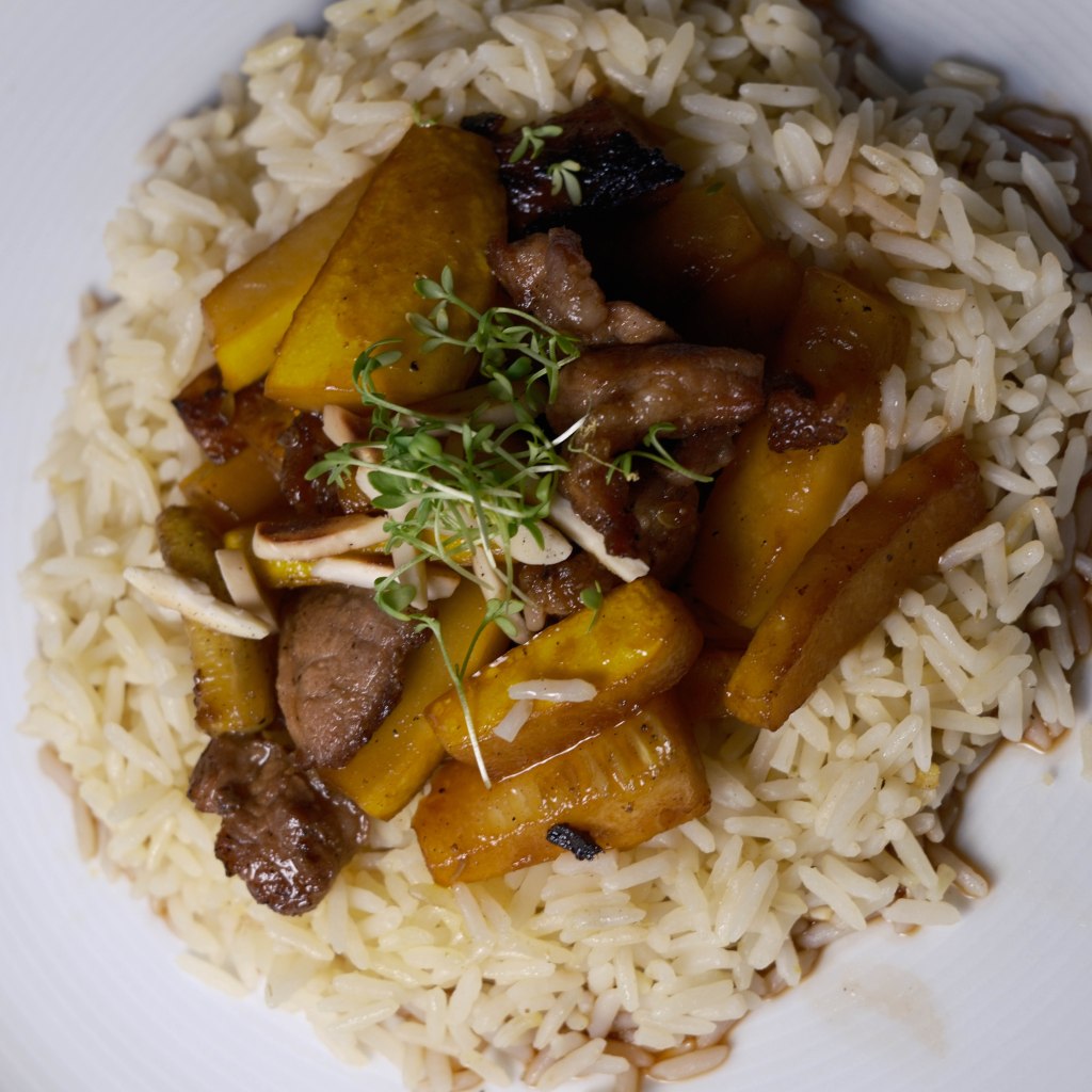Reis mit Schwein an Teriyaki-Sauce