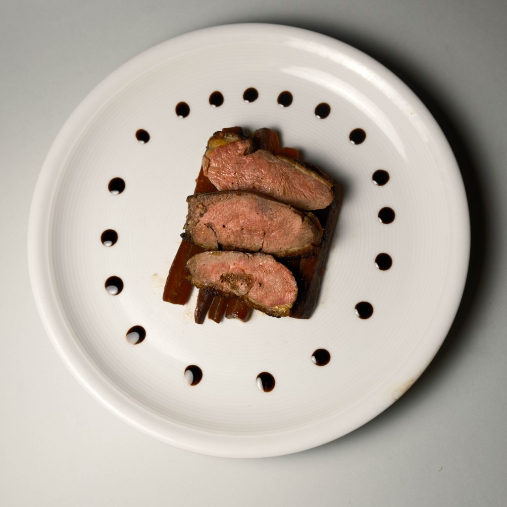 - Die Entenbrust quer in Scheiben schneiden. Die Sauce auf dem Teller verteilen, die Karotten darüber anrichten und die Entenbrust auf das Gemüse legen.
