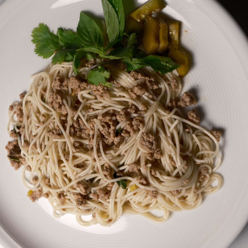 - Mit der Fleischbouillon, der Fischsauce und dem Reisessig ablöschen, etwas einkochen lassen. Gehacktes Thai-Basilikum und Koriander beigeben und zu Schluss mit dem Sesamöl parfümieren.