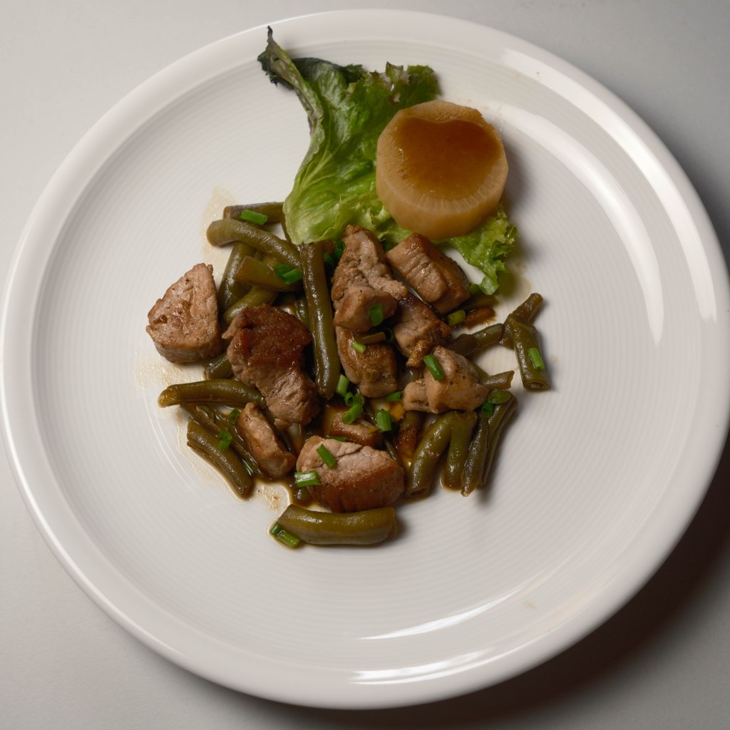 - Die Bohnen mit dem Medaillon zur Sauce geben und nochmals 1 – 2 Min. kochen. Das Zwiebelgrün darüberstreuen.