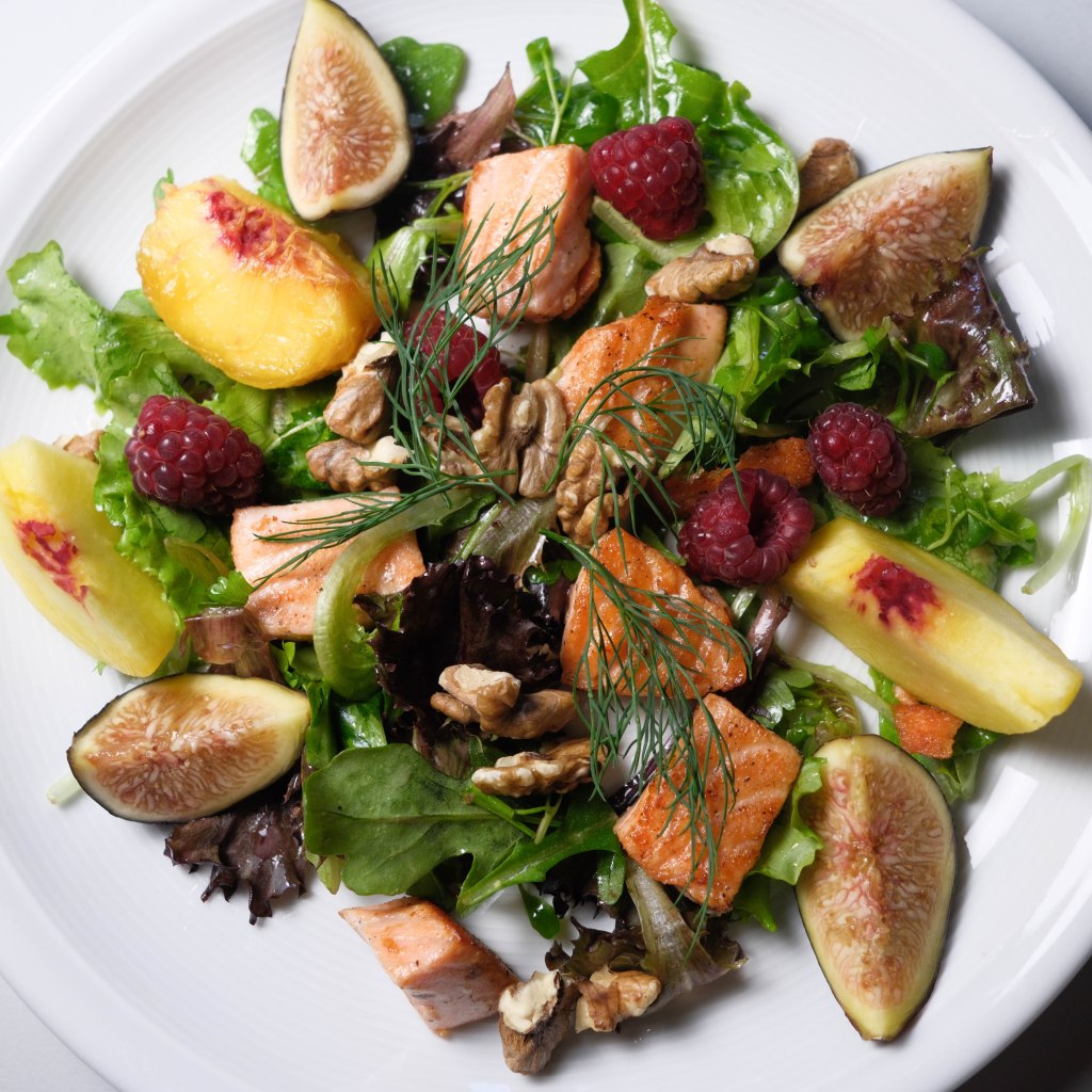 - Den Salat auf dem Teller anrichten, den Fisch darüberverteilen, mit den Pfirsichschnitzen, den Feigen, und den Himbeeren garnieren. Die Baumnüsse und den Dill darüber verteilen.